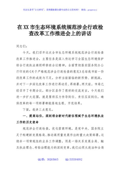 / 在XX市生态环境系统规范涉企行政检查改革工作推进会上的讲话