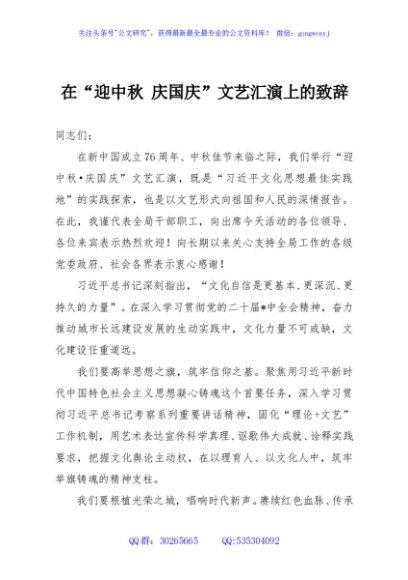 / 在“迎中秋 庆国庆”文艺汇演上的致辞