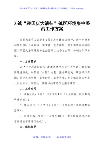 / X镇“迎国庆大清扫”镇区环境集中整治工作方案