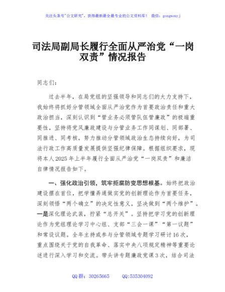 / 司法局副局长履行全面从严治D“一岗双责”情况报告