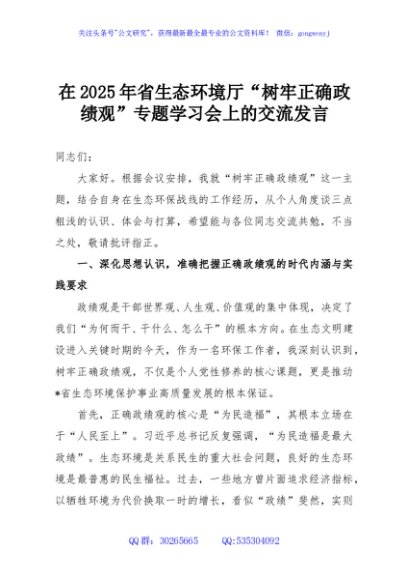 / 在2025年省生态环境厅“树牢正确政绩观”专题学习会上的交流发言