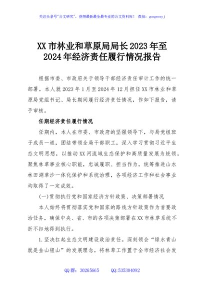 / XX市林业和草原局局长2023年至2024年经济责任履行情况报告