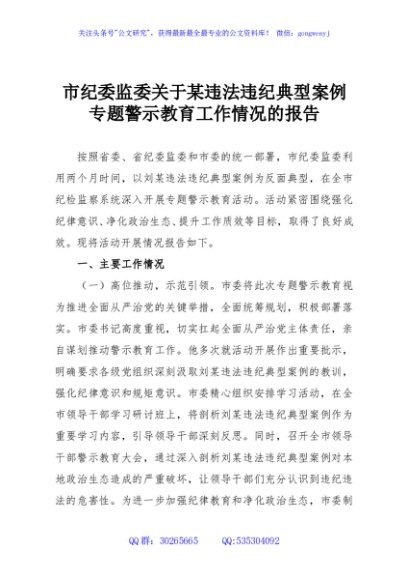 / 市纪委监委关于某违法违纪典型案例专题警示教育工作情况的报告