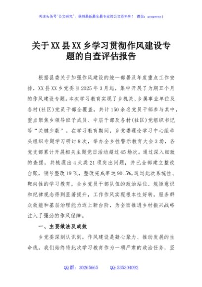 / 关于XX县XX乡学习贯彻作风建设专题的自查评估报告