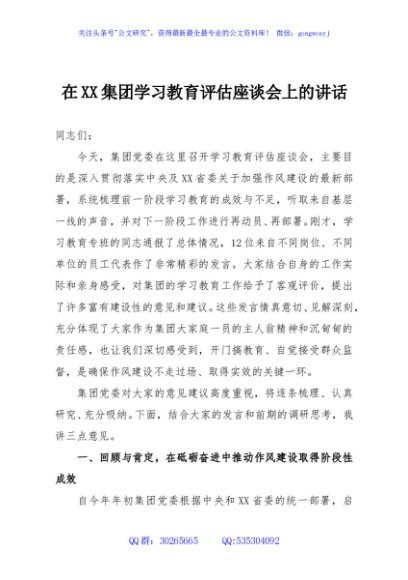 / 在XX集团学习教育评估座谈会上的讲话