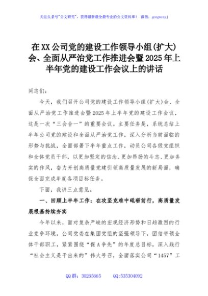 / 在XX公司党的建设工作领导小组(扩大)会、全面从严治党工作推进会暨2025年上半年党的建设工作会议上的讲话