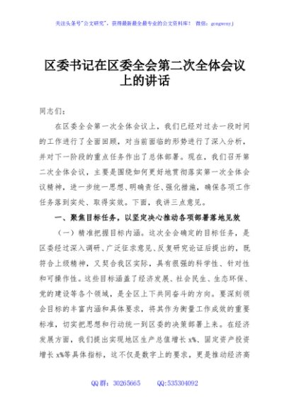/ 区委书记在区委全会第二次全体会议上的讲话