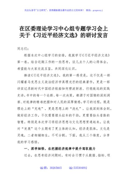 / 在区委理论学习中心组专题学习会上关于《习近平经济文选》的研讨发言