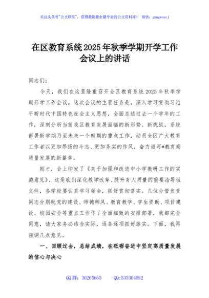 / 在区教育系统2025年秋季学期开学工作会议上的讲话