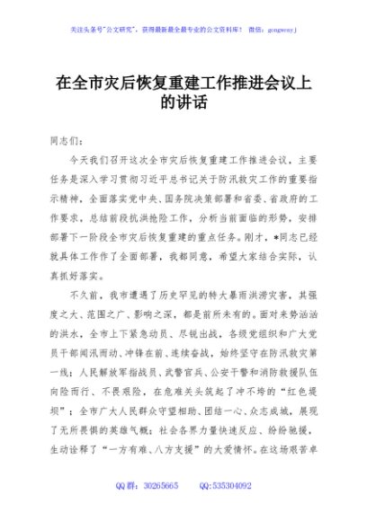 / 在全市灾后恢复重建工作推进会议上的讲话