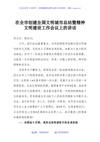 / 在全市创建全国文明城市总结暨精神文明建设工作会议上的讲话