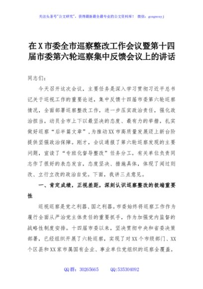 / 在X市委全市巡察整改工作会议暨第十四届市委第六轮巡察集中反馈会议上的讲话