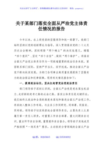 / 关于某部门落实全面从严治党主体责任情况的报告