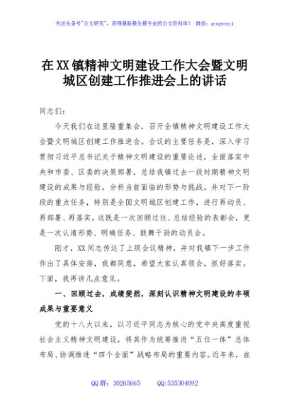 / 在XX镇精神文明建设工作大会暨文明城区创建工作推进会上的讲话