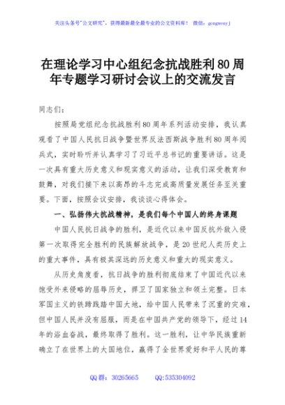 / 在理论学习中心组纪念抗战胜利80周年专题学习研讨会议上的交流发言