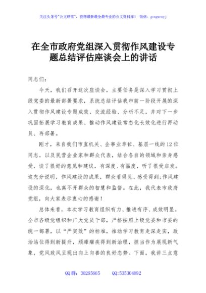 / 在全市政府党组深入贯彻作风建设专题总结评估座谈会上的讲话