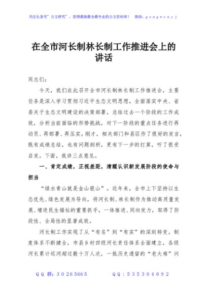 / 在全市河长制林长制工作推进会上的讲话