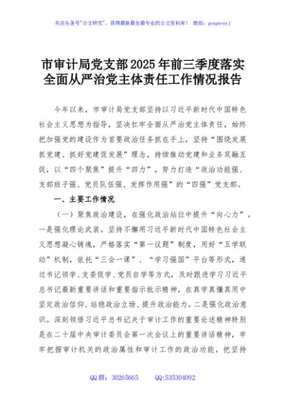/ 市审计局党支部2025年前三季度落实全面从严治党主体责任工作情况报告