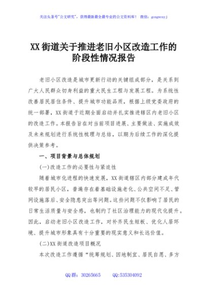 / XX街道关于推进老旧小区改造工作的阶段性情况报告