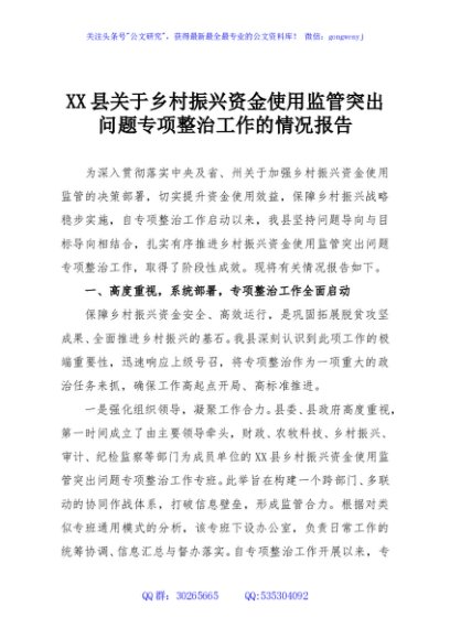 / XX县关于乡村振兴资金使用监管突出问题专项整治工作的情况报告