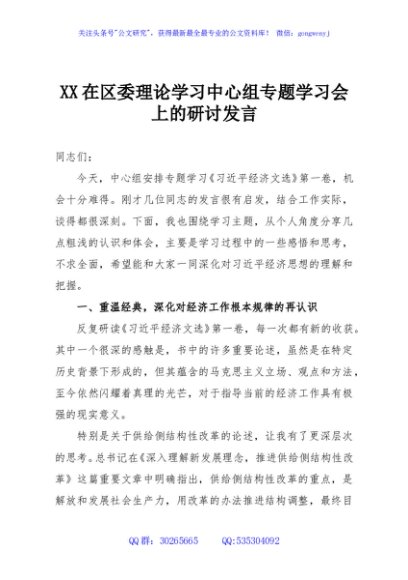 / XX在区委理论学习中心组专题学习会上的研讨发言