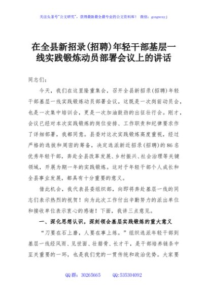 / 在全县新招录(招聘)年轻干部基层一线实践锻炼动员部署会议上的讲话