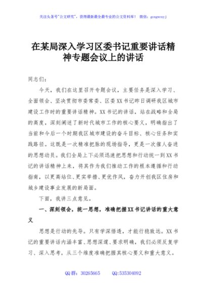 / 在某局深入学习区委书记重要讲话精神专题会议上的讲话