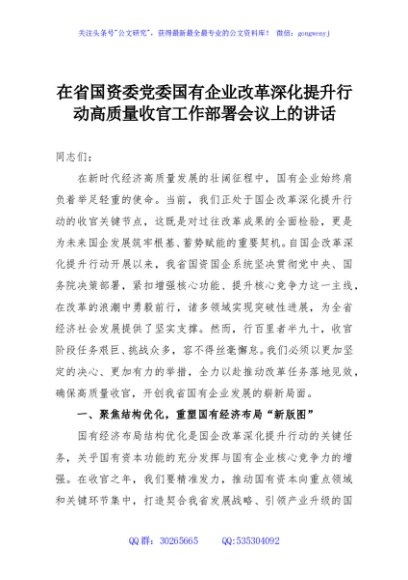 / 在省国资委党委国有企业改革深化提升行动高质量收官工作部署会议上的讲话