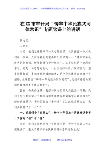 / 在XX市审计局“铸牢中华民族共同体意识”专题党课上的讲话
