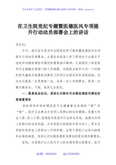 / 在卫生院党纪专题暨医德医风专项提升行动动员部署会上的讲话