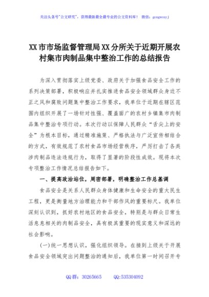 / XX市市场监督管理局XX分所关于近期开展农村集市肉制品集中整治工作的总结报告