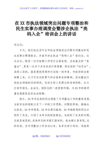 / 在XX市执法领域突出问题专项整治和民生实事办理调度会暨涉企执法“亮码入企”培训会上的讲话