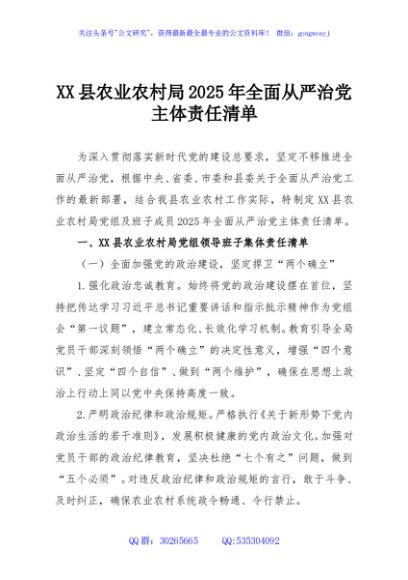 / XX县农业农村局2025年全面从严治党主体责任清单