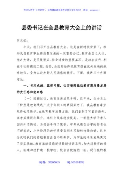 / 县委书记在全县教育大会上的讲话