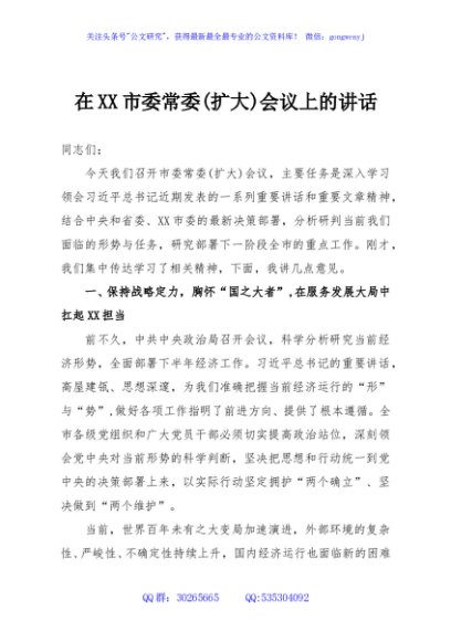 / 在XX市委常委(扩大)会议上的讲话