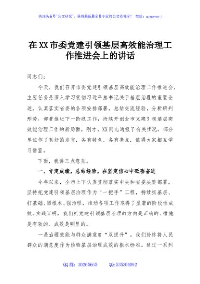 / 在XX市委党建引领基层高效能治理工作推进会上的讲话