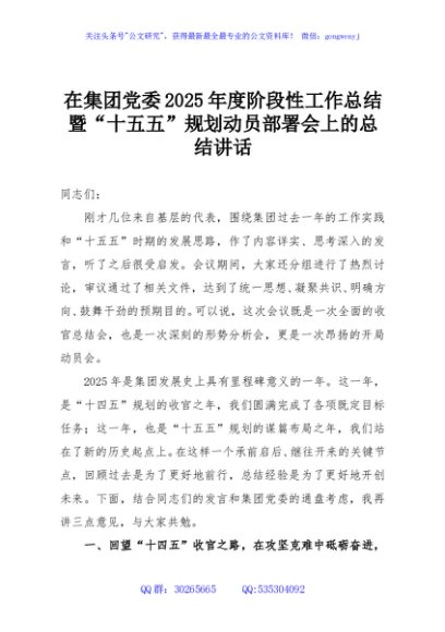 / 在集团党委2025年度阶段性工作总结暨“十五五”规划动员部署会上的总结讲话