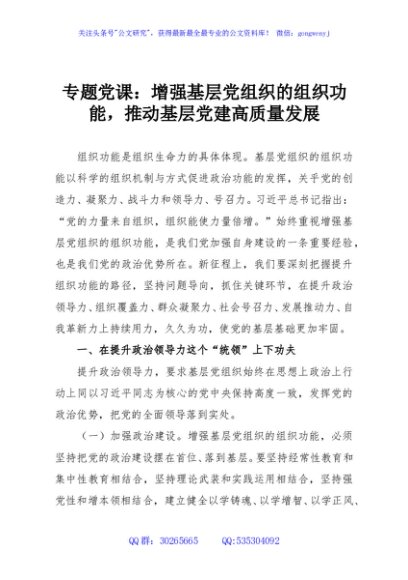 / 专题党课:增强基层党组织的组织功能,推动基层党建高质量发展