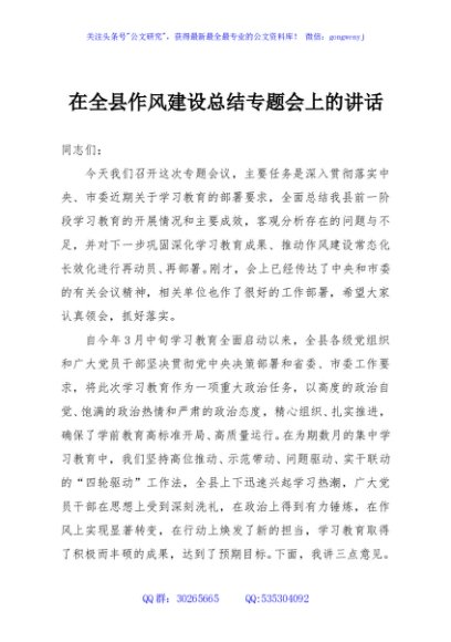 / 在全县作风建设总结专题会上的讲话