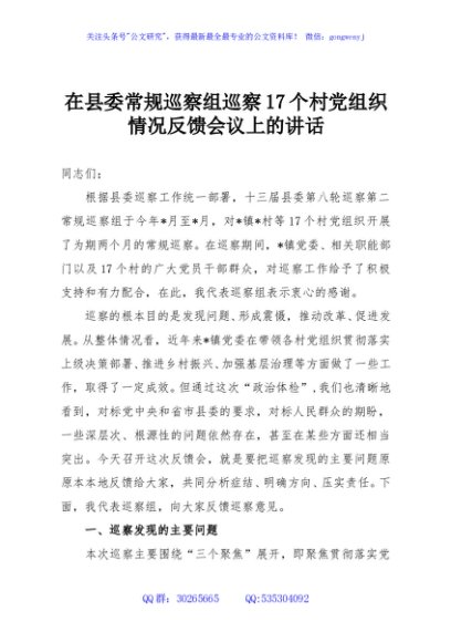 / 在县委常规巡察组巡察17个村党组织情况反馈会议上的讲话