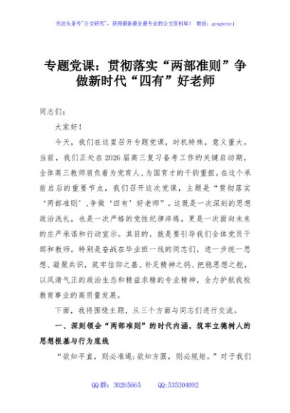 / 专题党课:贯彻落实“两部准则”争做新时代“四有”好老师