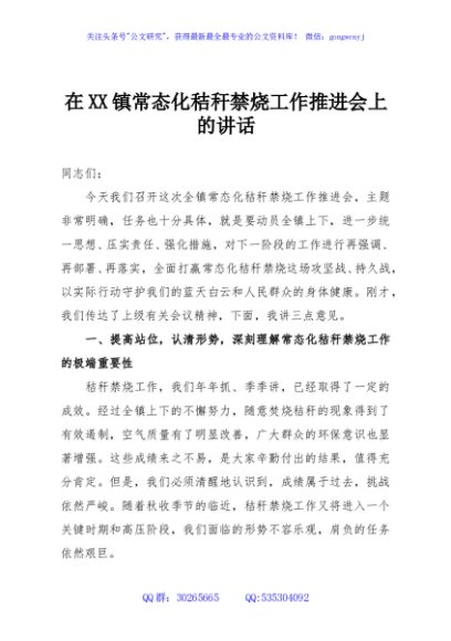 / 在XX镇常态化秸秆禁烧工作推进会上的讲话