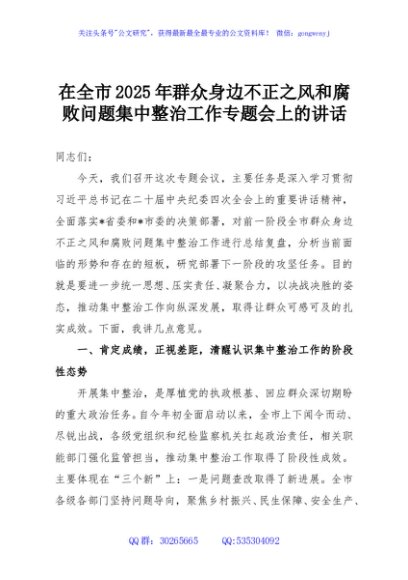 / 在全市2025年群众身边不正之风和腐败问题集中整治工作专题会上的讲话