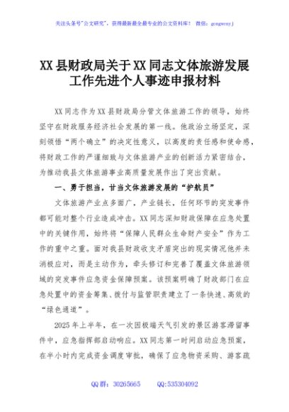/ XX县财政局关于XX同志文体旅游发展工作先进个人事迹申报材料