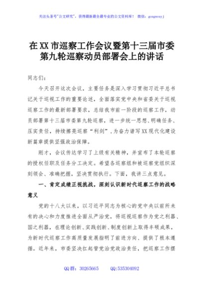 / 在XX市巡察工作会议暨第十三届市委第九轮巡察动员部署会上的讲话