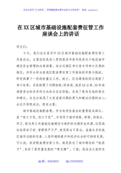 / 在XX区城市基础设施配套费征管工作座谈会上的讲话