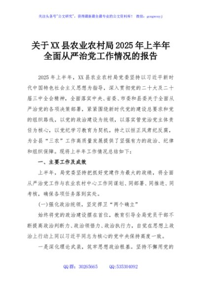 / 关于XX县农业农村局2025年上半年全面从严治党工作情况的报告