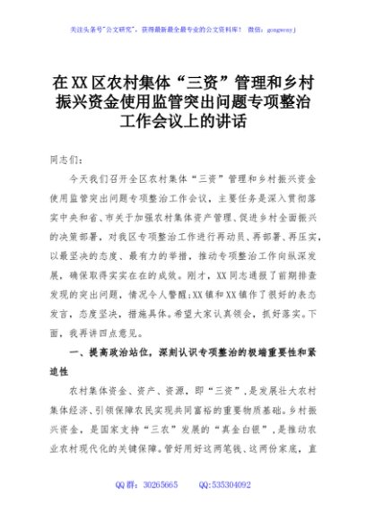 / 在XX区农村集体“三资”管理和乡村振兴资金使用监管突出问题专项整治工作会议上的讲话