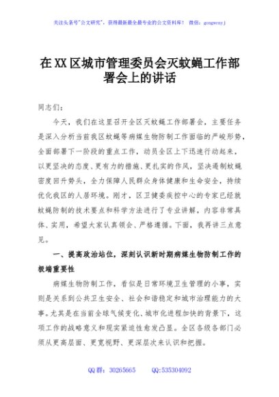 / 在XX区城市管理委员会灭蚊蝇工作部署会上的讲话