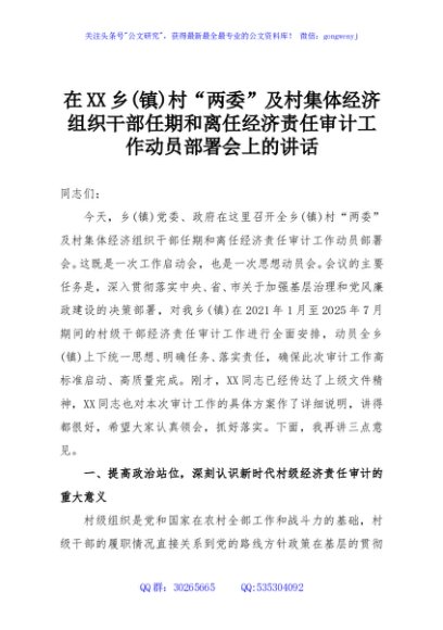 / 在XX乡(镇)村“两委”及村集体经济组织干部任期和离任经济责任审计工作动员部署会上的讲话